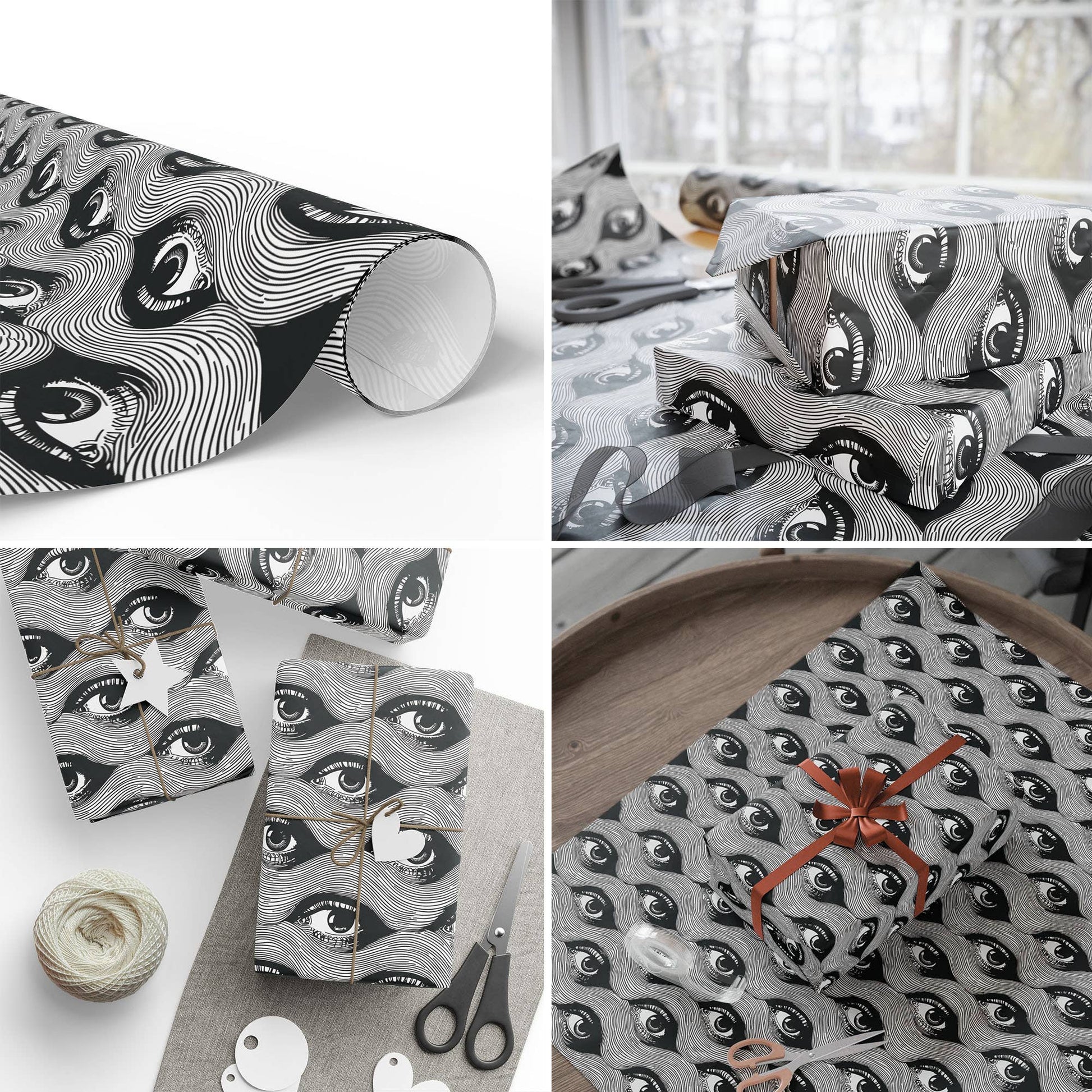 These rolls each feature three sheets of my Eye Waves pattern in black and white. They are printed on a stunning 20x29 inch heavy Matte Fine Art gift wrap paper and each sheet contains a small branded logo in the bottom lefthand corner. T