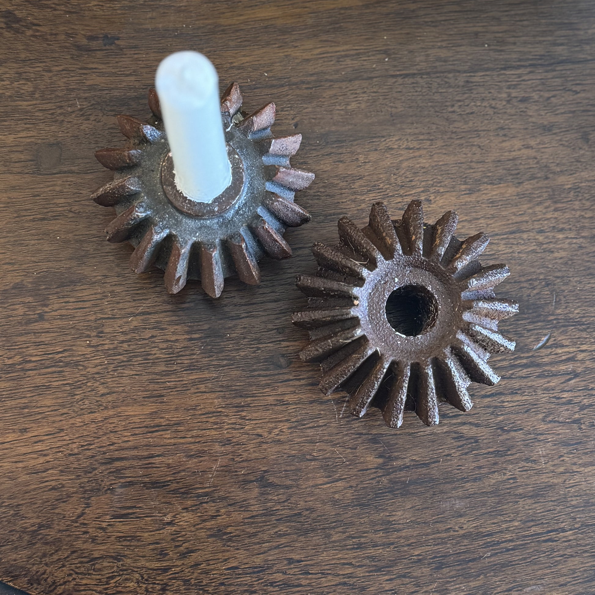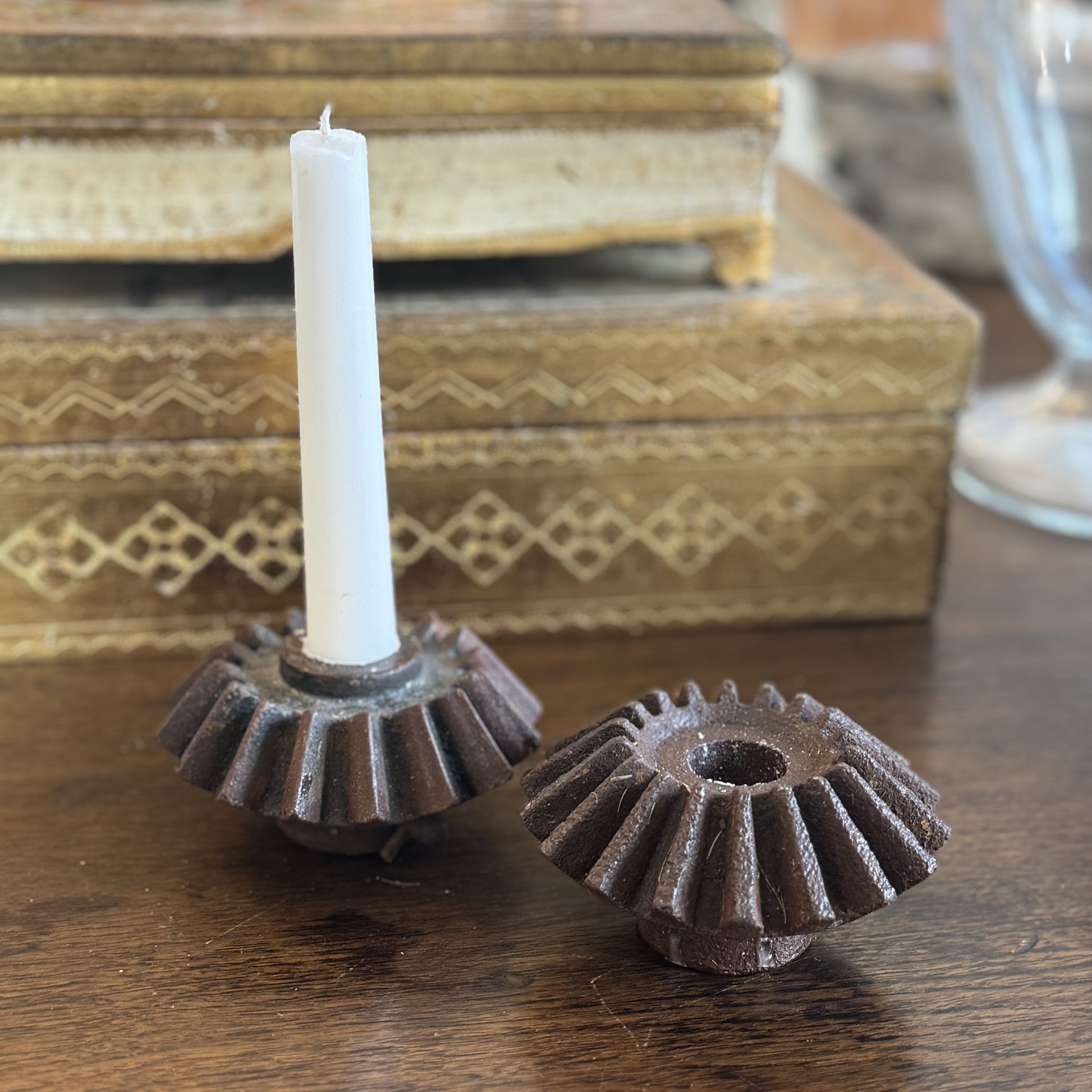 Heavy-weight, weathered metal gears are the base of these gorgeous candlesticks. 4”diam x 2. Sold as a pair. Vintage