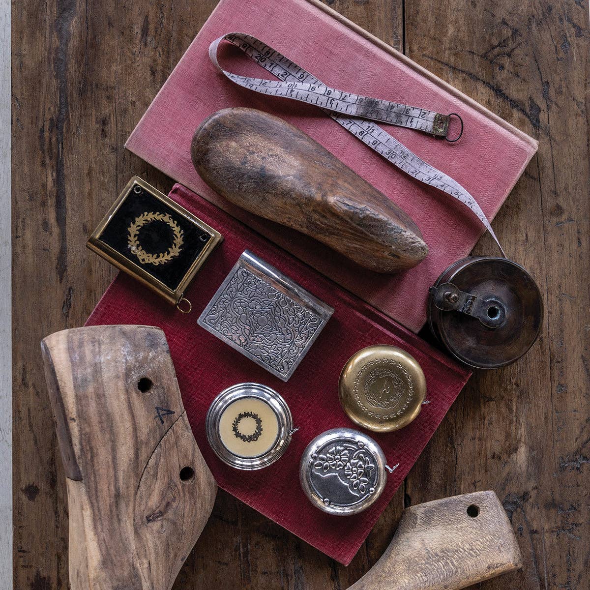 We have modeled our Measuring Tape reproductions on vintage inspired designs. Each features a decorative metal casing and thin, but durable measuring ribbon. The Measuring Tape Collection can sit out as a decorative accent or be tucked deceptively in a carry-on or pocket for travel. Art deco inspired, the Measuring Tape Box with Wreath takes its inspiration from cigarette tins of the roaring 1920s. The antique gold metal case has a black stone inset with a metal wreath inlay that is dashing in style.