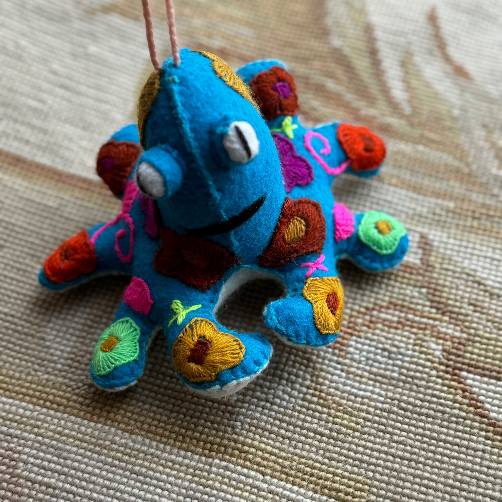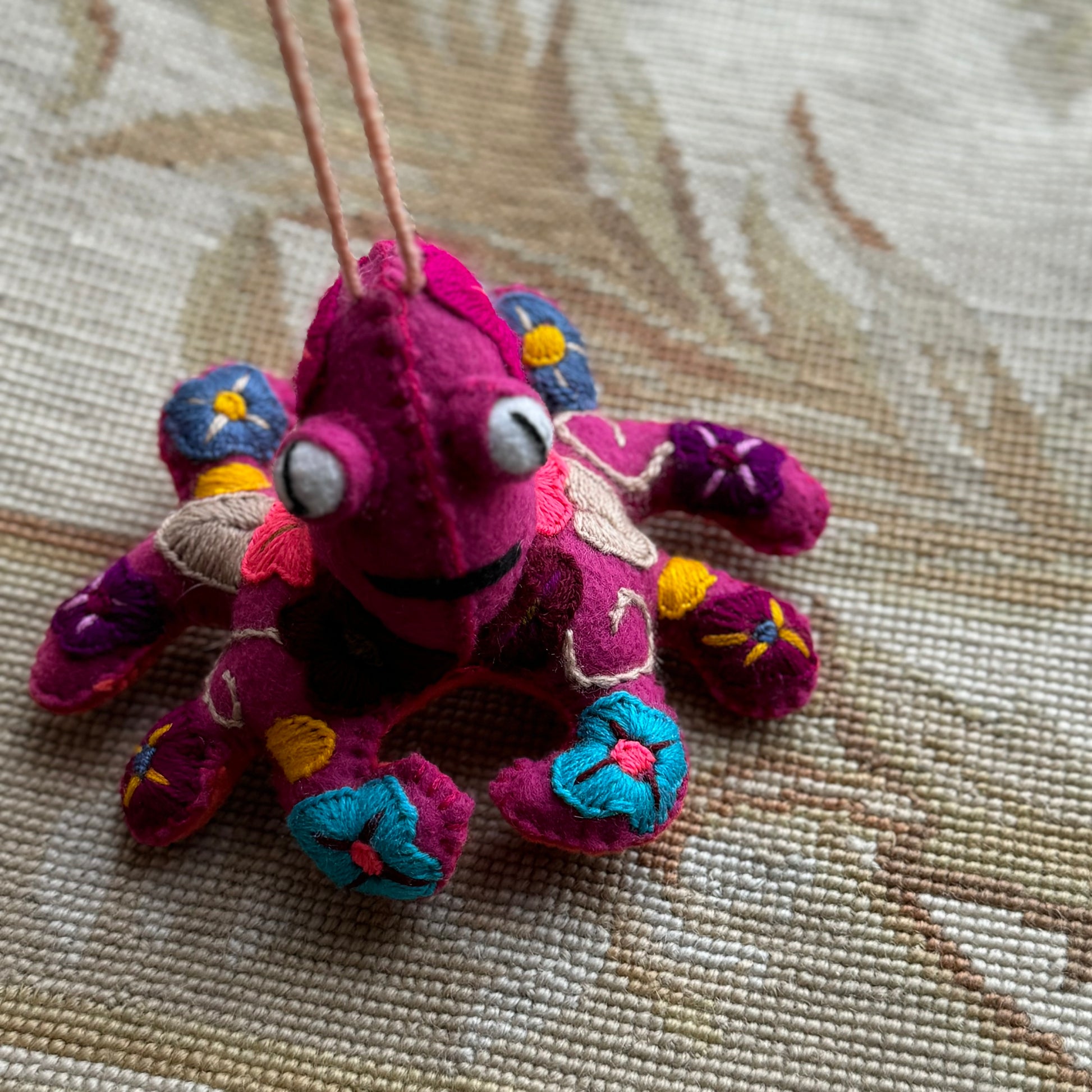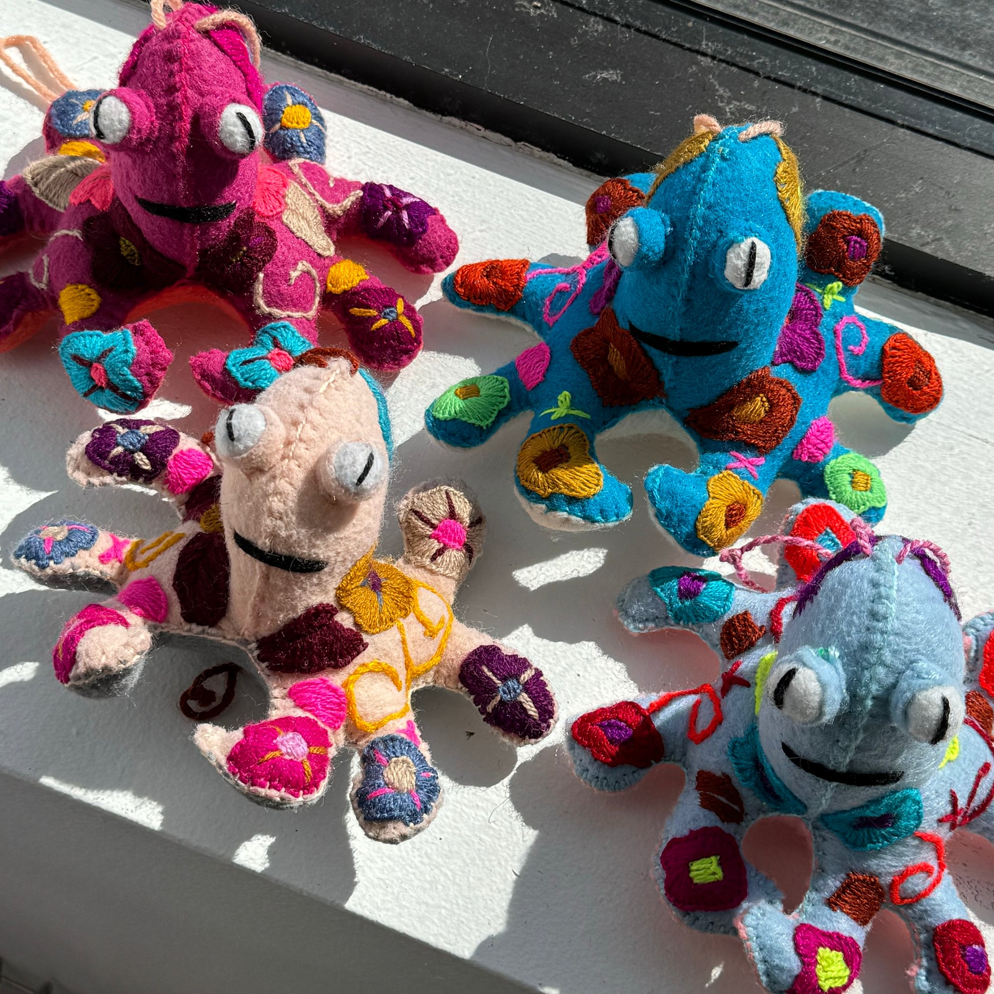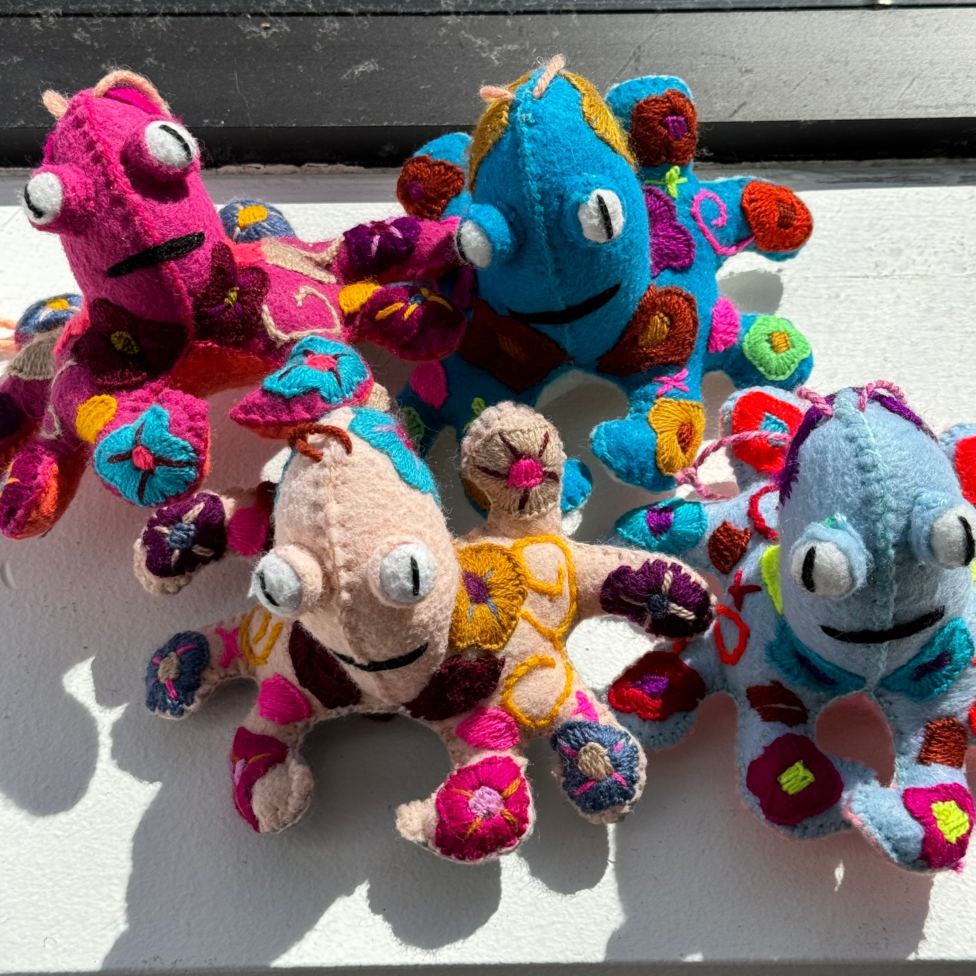 Spectacular embroidered octopi! Each one full of rich, color, and hand embroidered. Hecho en México. Wool and Cotton.