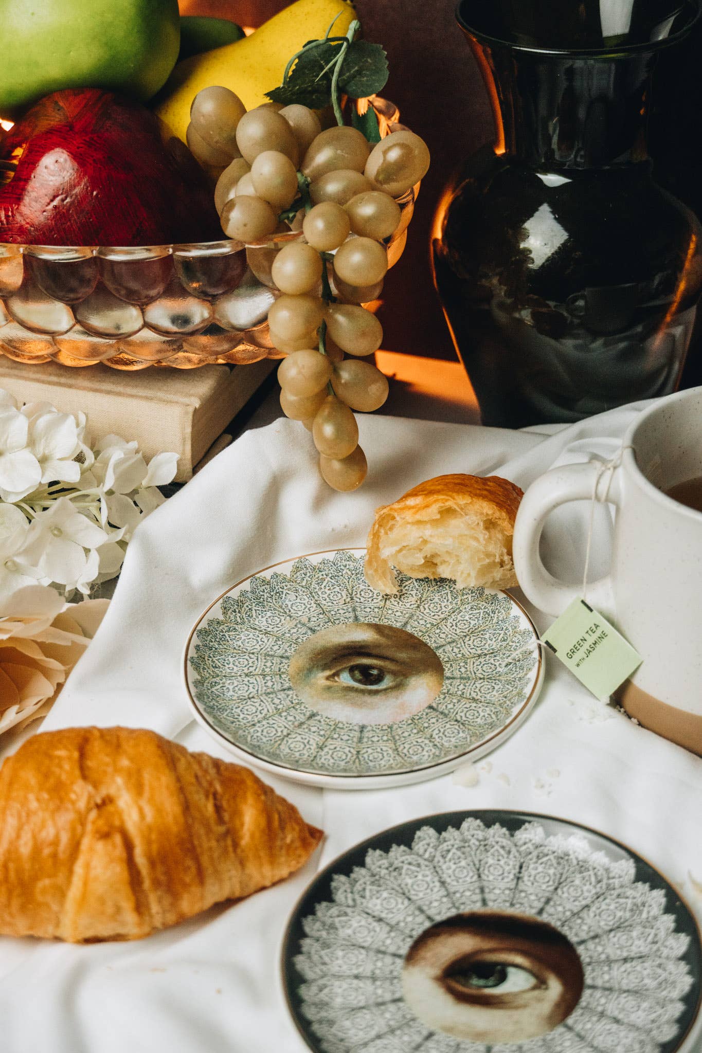 The Secret Lover dish offers a striking balance of classic and avant-garde design. This 4-inch, food-safe ceramic dish features a mesmerizing central eye encircled by intricate lace-like patterns in a neutral palette. Inspired by the elegance of Elizabethan artistry, the bold contrast of the detailed designs adds depth and sophistication to any setting. Whether used for serving small bites or as a decorative statement piece, this dish blends historical elegance with contemporary flair, making it a captivating addition to your home.
