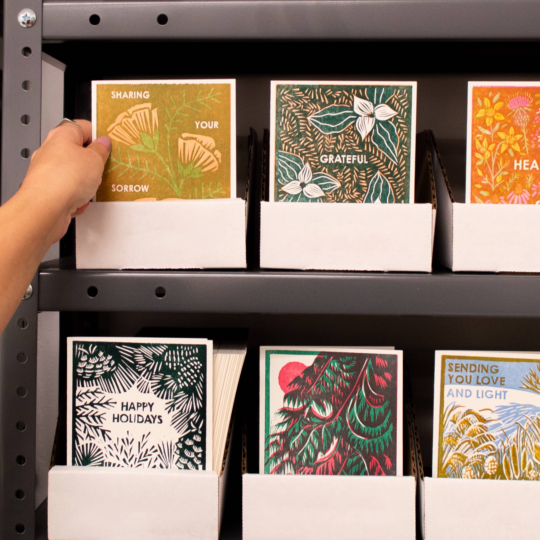Letterpress, 100% post-consumer recycled paper, A2, blank inside, cello sleeve with envelope.