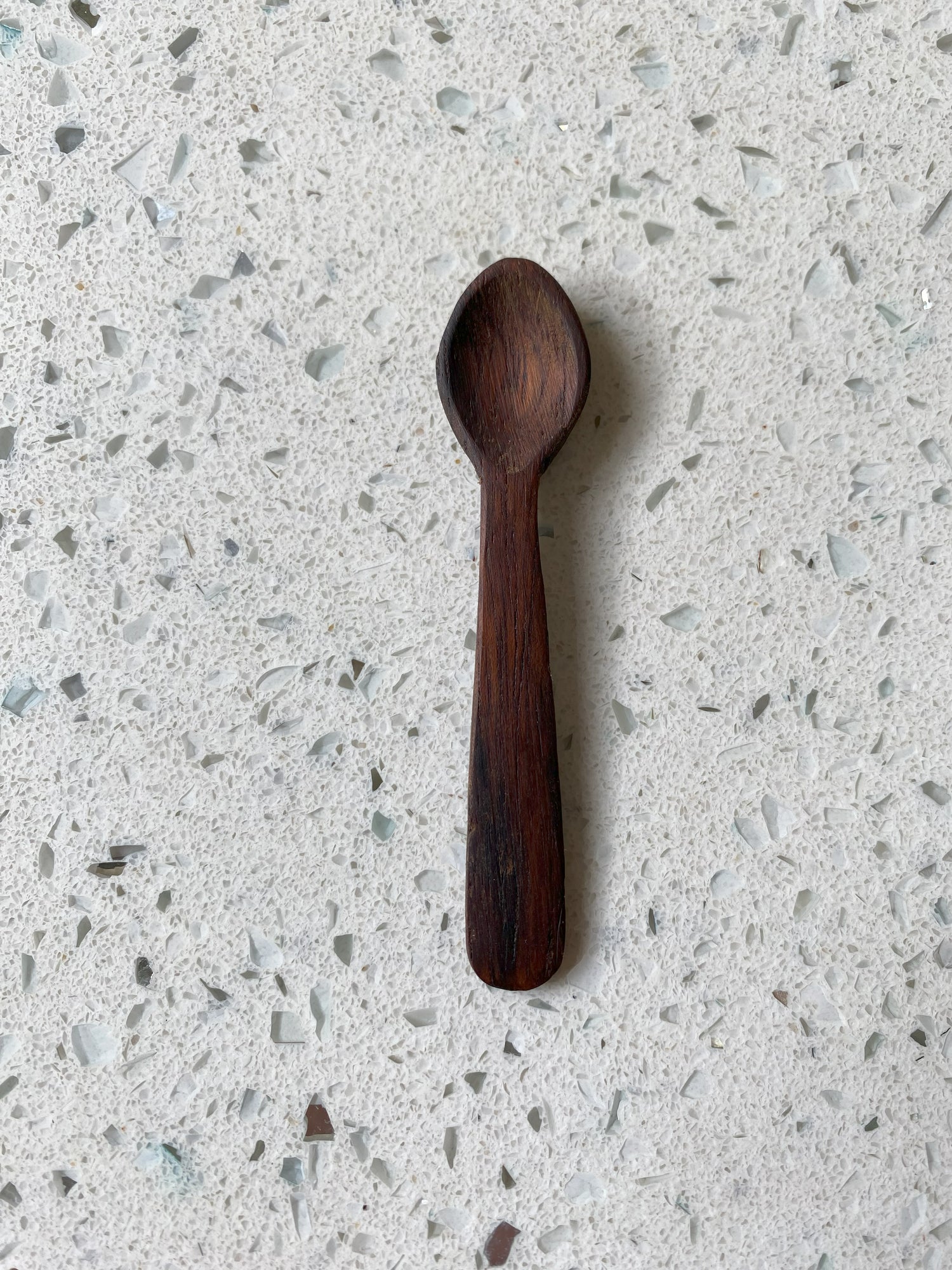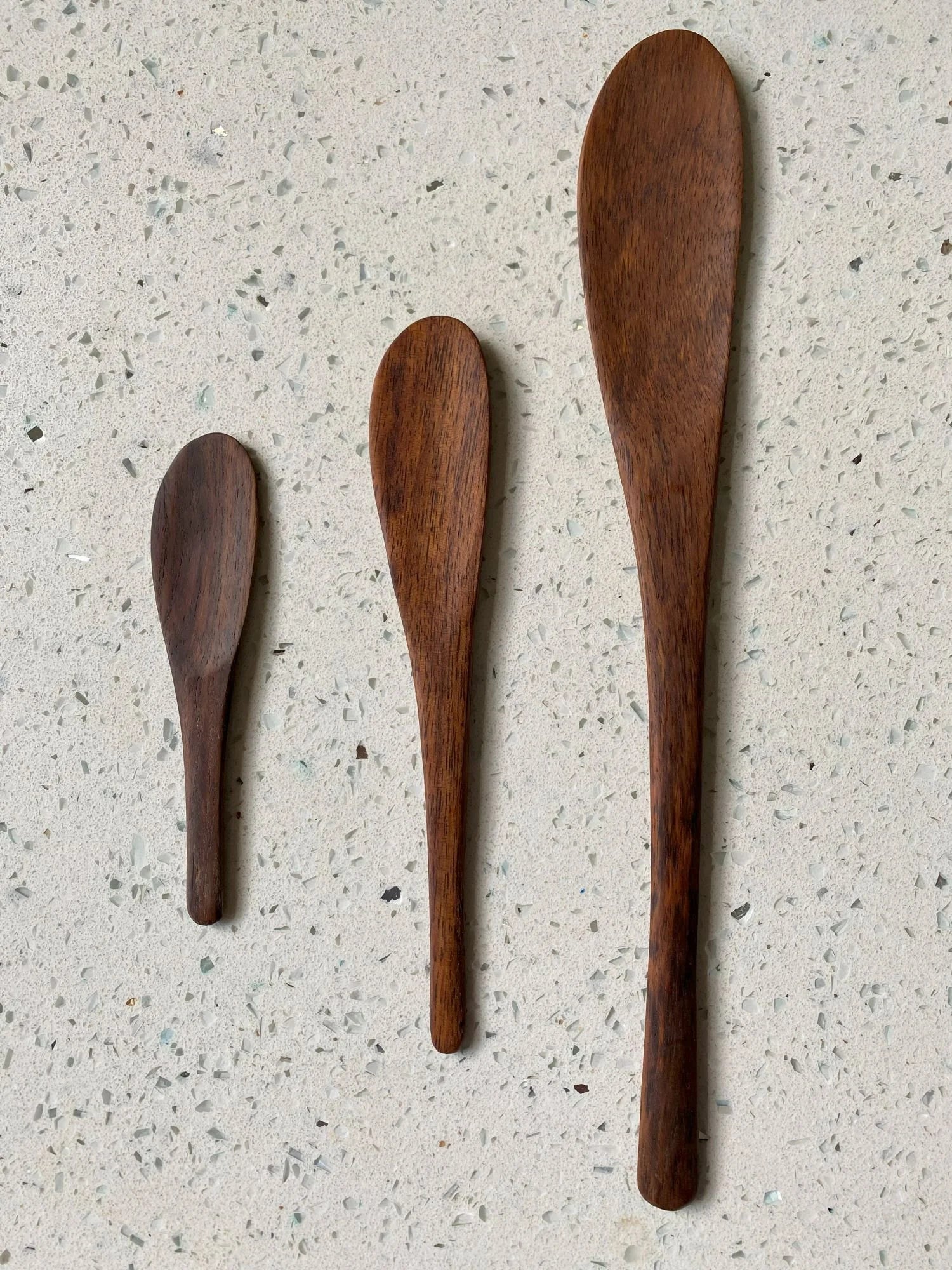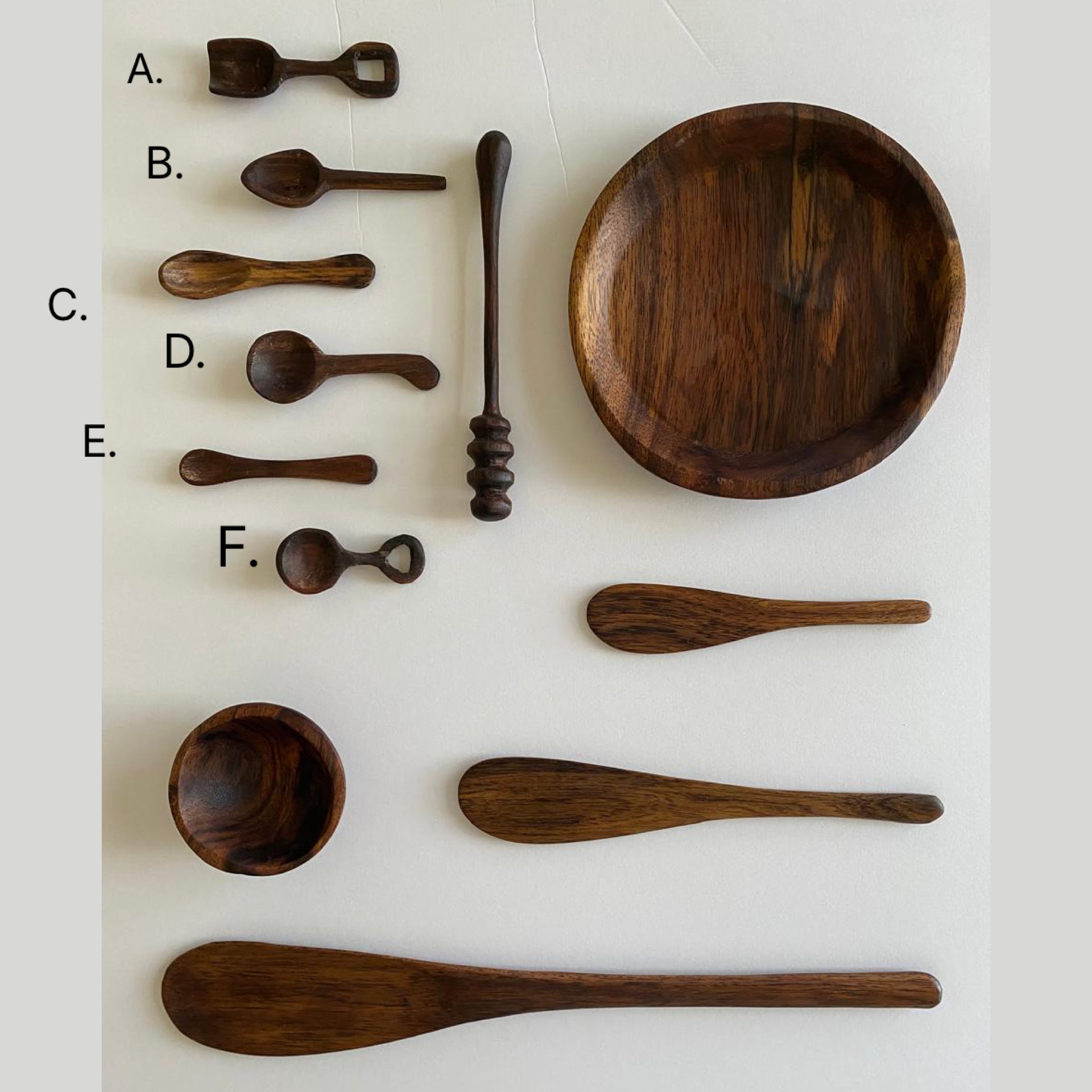 Hand Carved in Kenya from Mesquite wood. I could not decide on my favorite design in the tiny serving spoons (3") so I ordered them all. Perfect for condiments, salt cellars and more. The plates are appetizer size, approx 6" in diam. The spreaders are available in 5", 8", or 12" and perfect to keep stoveside or use as a serving piece to add interest to your tablescape. Each piece is unique.